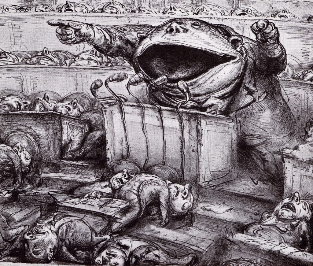 Ein beliebtes Motiv von A. Paul Weber sind politische Themen wie etwa seine Lithografie „Das Großmaul“, das hier umgeben von schlafenden Abgeordneten seine Rede hält. Weber prangert hier einen bestimmten Redner-Typen an, der besonders die eigenen Verdienste übertrieben darstellt. Was es damals schon gab, ist heute wieder topaktuell: Der Populismus ist in den Medien angekommen und wird kritisch gesehen. Dass Populist*innen dennoch bei vielen Bürger*innen Gehör finden, könnte an deren scheinbar einfachen Lösungen für komplexe Probleme liegen oder am Benennen vermeintlicher Ursachen angeblicher Probleme. Meist ist der Wahrheitsgehalt zweifelhaft. Durch die neuen Medien können Thesen von Populisten jedoch ohne große Überprüfung schnell und weit verbreitet werden. Webers Werk empfiehlt daher: Nicht zuhören und seine Zeit lieber mit gesundheitsförderndem Schlafen verbringen.