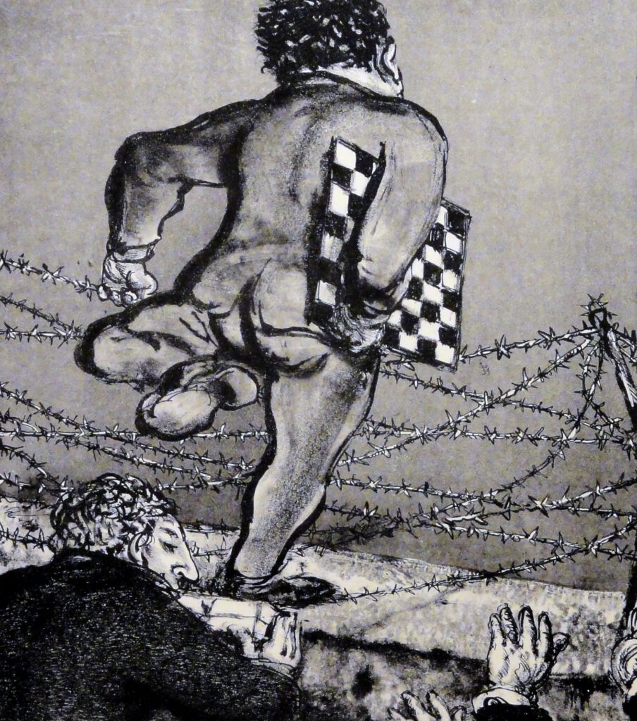 Weber stellt dies durch einen Mann mit einem Schachbrett unterm Arm, der gerade über einen Mauer und Stacheldraht klettert, dar. Unten hält ein weiterer Mann einen Kasten mit den Spielfiguren.