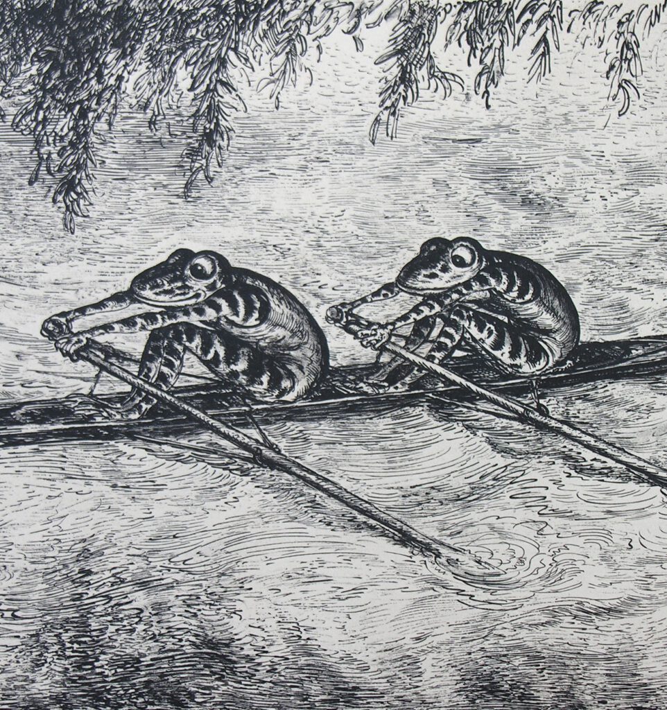 Für den nach dem Kunsthistoriker und Leiter der Hamburger Kunsthalle Alfred Lichtwark benannten Kalender des Hamburger Stadtteils Bergedorf gestaltete A. Paul Weber einige Illustrationen, so auch diese Ruderszene: Die zwei Frösche in Badekleidung rudern sichtlich erfreut und zugleich höchst konzentriert auf einem See. Die Weideäste am oberen Bildrand verraten, dass sie sich in der Nähe von einem Ufer befinden. Solche possierlichen Tierbilder druckte Weber während seines Lebens immer wieder und erfüllte sich mit deren Veröffentlichung im „Tierbilderbuch“ 1974 einen Traum.